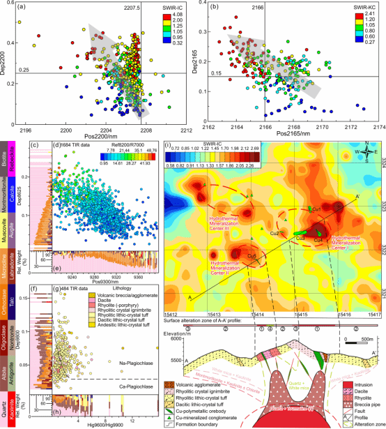 图1 扎隆矿床(a)白云母族矿物Pos2200,Dep2200与SWIR-IC的关系散点图;(b)高岭石Pos2165,Dep2165与SWIR-KC的关系散点图;(c)不同Dep8625值的石英在TIR识别矿物相对含量中的变化图;(d)石英的TIR标量关系图;(e)不同Pos9300值的石英在TIR识别矿物相对含量中的变化图;(f)不同Dep9800值的长石族在TIR识别矿物相对含量中的变化图;(g)长石族的TIR标量与岩性关系图;(h)不同Hig9600/Hig9900值的长石族在TIR识别矿物相对含量中的变化图;(i)推测热液矿化中心及铜多金属成矿模式